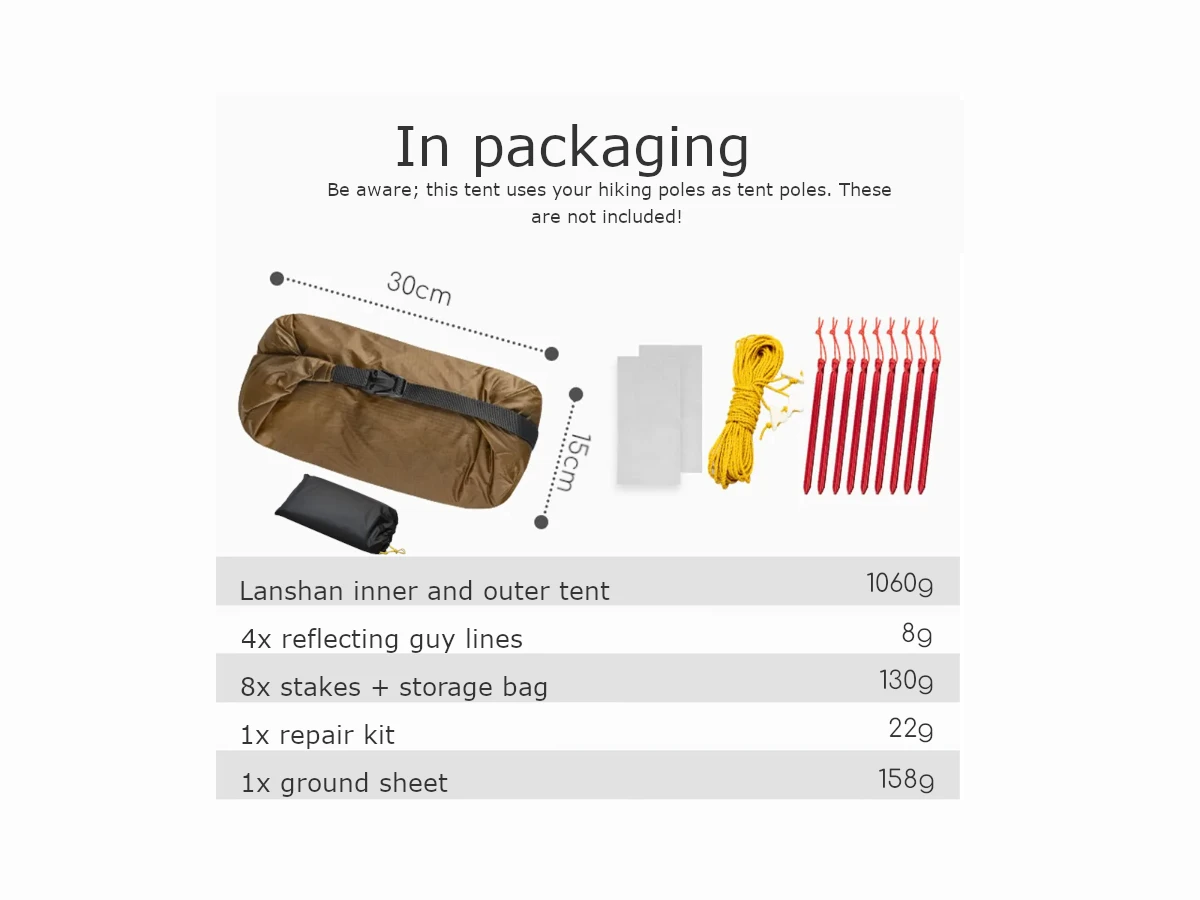 Let op: deze tent gebruikt 2 wandelstokken als tentstokken, tot een lengte van ~135cm. Deze zijn niet inbegrepen!
