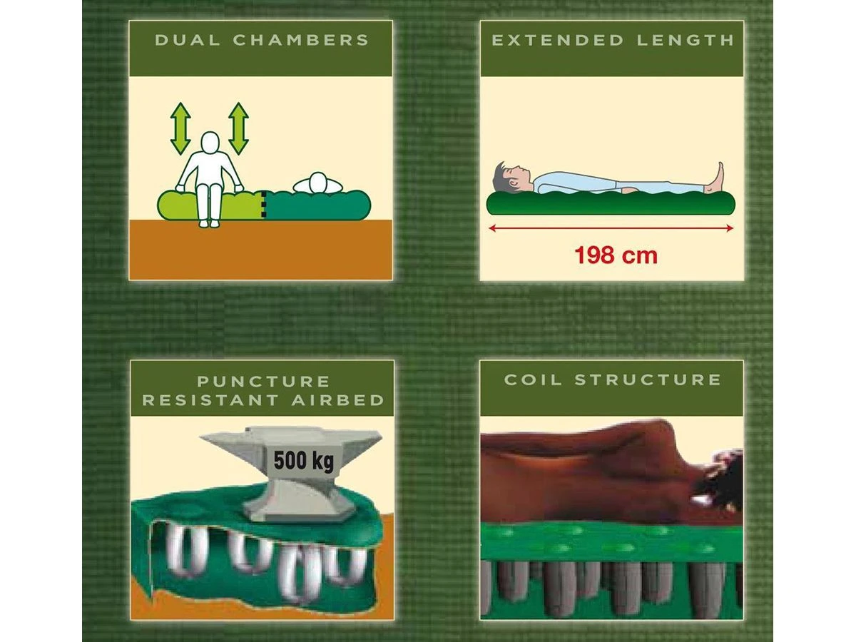 -Royaal luchtbed 2 persoons-40 coils voor optimaal slaapcomfort-Afmetingen: 198 x 137 x 22 cm-Maximaal gewicht: 295 kg-Materiaal: Met geborsteld polyester gelamineerd pvc-Eigenschappen: Puncture Guardā¢; Double Lockā¢-ventiel-Accessoires: Wrap ‘N’ Rollā¢-draagtas bevestigd aan het bed-Opbergzak (100% Polyester): Meegeleverd-Gewicht: 3.8 kg