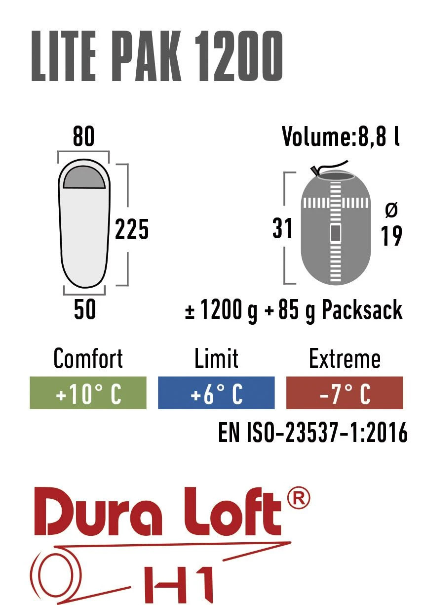 De zachte en slijtvaste buitenstof is geïmpregneerd met BIONIC-FINISH®ECO. Deze water- en vuilafstotende technologie is PFC-vrij, milieuvriendelijk en duurzaam. De buitenstof zonder doorgestikte naad vermijdt koudebruggen. Verder heeft de Lite Pak 1200 een ademende en huidvriendelijke voering en een hoogwaardige Dura Loft H1 vulling met hoge isolatiewaarde: de duurzame en gesiliconiseerde holle vezel is makkelijk comprimeerbaar en veerkrachtig.