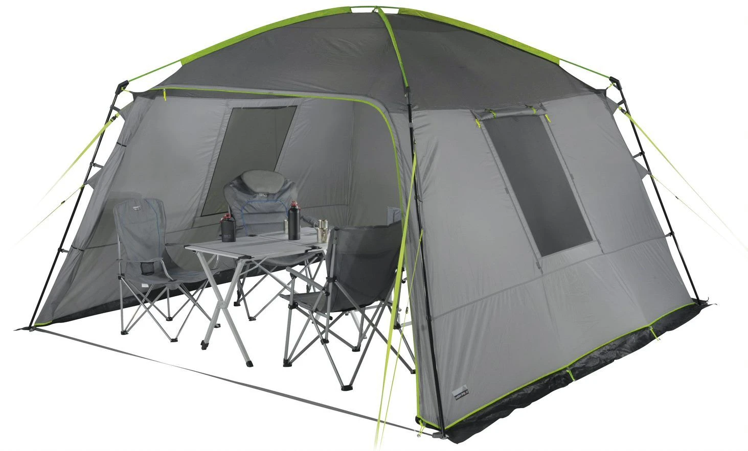 De vrijstaande paviljoen Cabana is geschikt voor allerlei festiviteiten en biedt optimale bescherming tegen zon, wind en regen. Ideaal basiskamp voor festivals, als partytent, of uitrustingstent voor tuinen en campings en als bevoorradingstent voor jeugdbewegingen. Het stalen frame in combinatie met dakbogen van glasvezel en ABS kunststof hoeken zorgen voor optimaal ruimtegebruik. Het paviljoen biedt veel ruimte op 12,25 m2 met een stahoogte van 210 cm. De veranda-voorwand met ritssluiting kan halverwege of volledig worden geopend, afhankelijk van het weer. Een helder folievenster met afdekflap zorgt voor licht in de tent. Twee grote muggengaasramen met geritste afdekflappen ventileren het woongedeelte en houden insecten op afstand. De permanente ventilatie zorgt ook op regenachtige dagen voor luchtcirculatie en moet altijd open staan. De slikranden rondom houden vuil en vocht weg. 4 neon gele verstelbare stormbanden en scheerlijnen zijn duidelijk zichtbaar in de schemering. Lamphouder voor verlichting. De zeer stabiele stalen haringen en V-haringen van 5 mm buigen zelfs op harde grond niet. De waterdicht getapete naden zorgen voor een betere naadscheurweerstand.