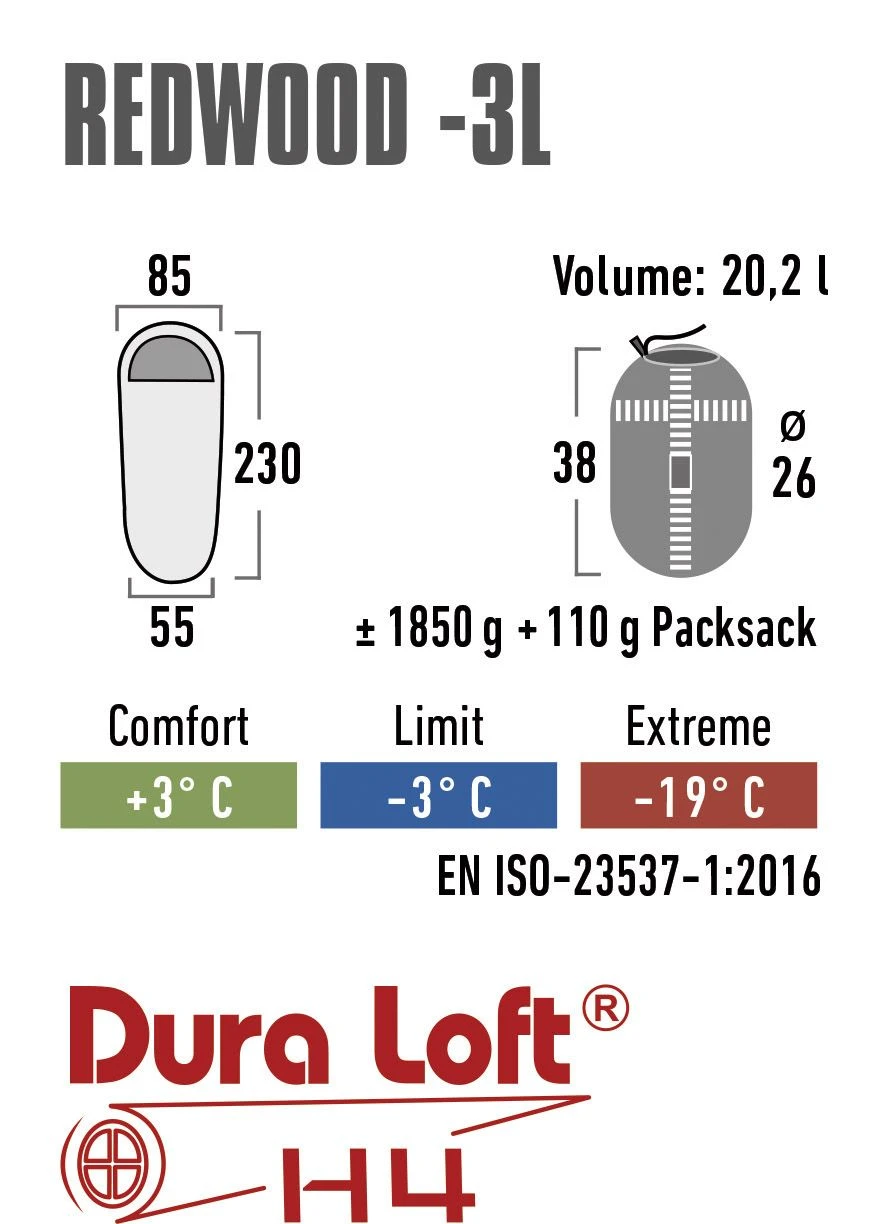 De regelbare capuchon met kussenvak en de thermische kraag voorkomen warmteverlies en bieden meer comfort. De extra lange tweeweg contourrits tot aan het voeteinde is aan twee zijden te openen voor extra ventilatie en bewegingsvrijheid; ideaal tijdens een warmere nacht. De anti-tochtstrook maakt de ritssluiting winddicht. De rits is overigens zelfblokkerend zodat die tijdens de nacht niet ongewild open gaat. Het anti-klemsysteem verhindert het vastlopen van de rits in de stof. De ritssluiting heeft een ergonomische ritstrekker. De slaapzak beschikt ook nog over een handige binnenzak aan de binnenkant met velcro-sluiting. De Redwood -3L wordt geleverd in een handige opberghoes met compressieriemen om de slaapzak nog compacter mee te nemen. Maximale lichaamslengte: 190 cm. Kan in de wasmachine op 30 °C.