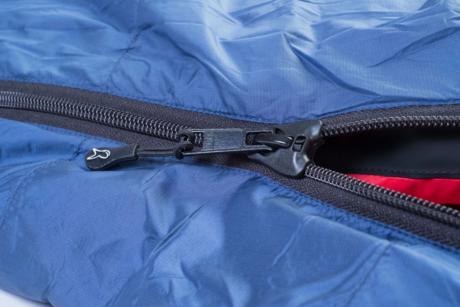 De slaapzak heeft een stevige 2-richting YKK-ritsluiting met een anti-snag slider. De anti-snag slider voorkomt dat er stof tussen de rits komt en je de rits dus altijd makkelijk kan openen; zo kan je altijd op gevoel in het donker zonder de paniek van een geblokkeerde rits een gang naar het toilet maken. En omdat het een tweeweg rits is, kan je de slaapzak ook bij de voeten openen voor wat verkoeling of extra bewegingsvrijheid.