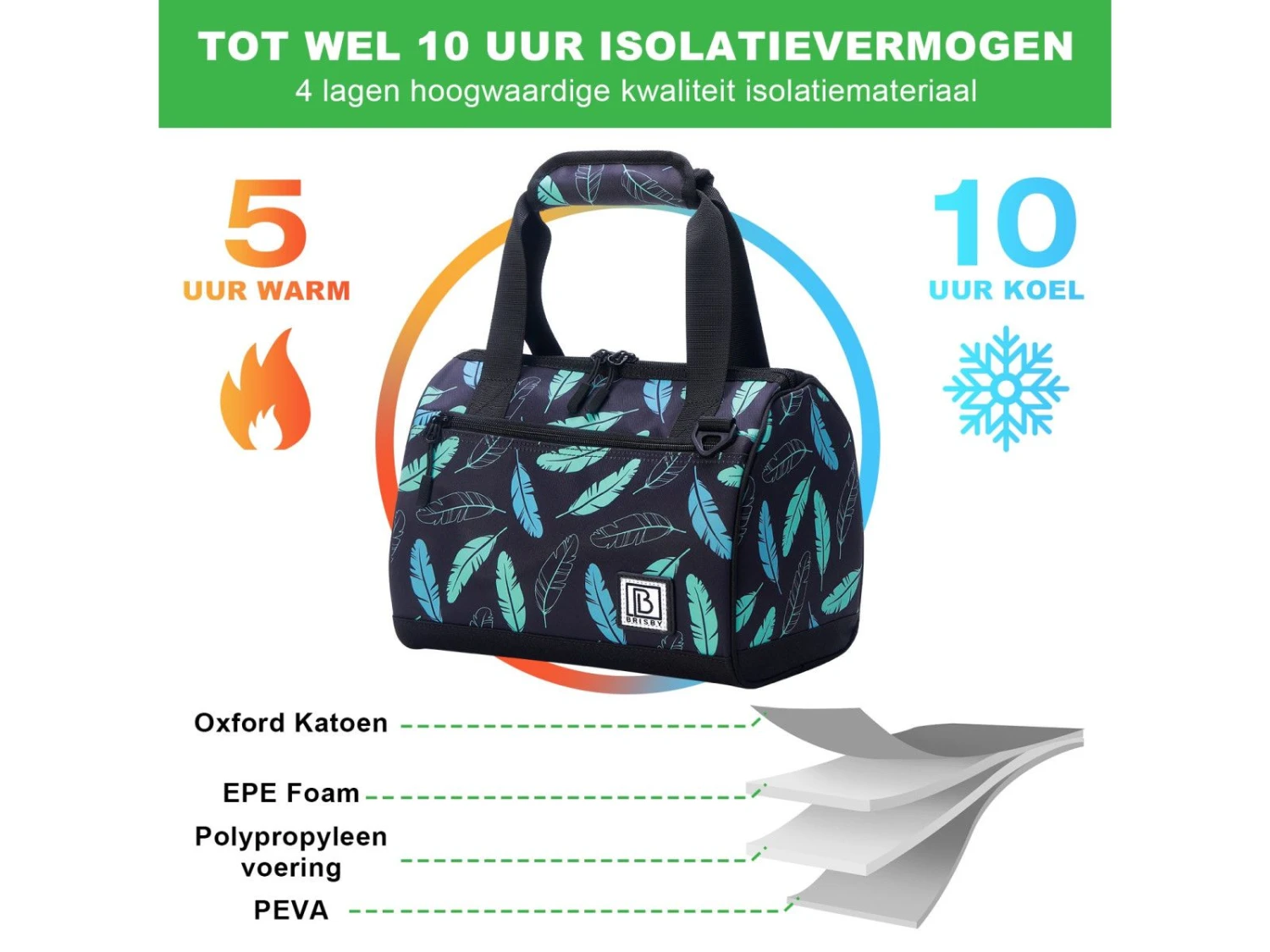 Ben je op zoek naar een topkwaliteit koeltas? Brisby 4 Laags Geïsoleerde Koeltas – Lunchtas 10 liter – Black Feathers- 2 Gratis koelelementen – Koelen en warm houdenZoek je een handige koeltas voor school of werk? De Brisby lunchtas is compact, veelzijdig en onmisbaar als het gaat om voedingswaren of dranken gekoeld bewaren. Deze ovale koeltas met een totale inhoud van 10 liter is ideaal om mee te nemen naar het strand of het bos, maar is tegelijkertijd een uitkomst in je zoektocht naar een school lunchbox of voor je werk. Hij houdt zowel warm als koel en je bewaart je eten en drinken op één plek. Daarnaast is er aan de voorzijde een vakje voor bijvoorbeeld je sleutels, telefoon of portemonnee. Neem dus gerust je eigen eten mee naar werk en school of ga gezellig een dagje weg. Bovendien ontvang je er twee gratis koelelementen bij en koop je hem in de kleur Black Feathers. Kortom: deze handige koeltas mag niet ontbreken in je tassencollectie, dus bestel ‘m snel voor je werk, school of vrije tijd.• Koelen en warm houdenDe werk of school lunchbox is ideaal om zowel te koelen als warm te houden. Je lunchpakket is en blijft dus altijd vers, tot maximaal 10 uur.• Comfortabele handvatten en schouderbandHet draagcomfort wordt bevorderd door twee comfortabele handvatten en de schouderband. Hij is dus gemakkelijk mee te nemen aan je fietsstuur of over je schouder te dragen.• Slijtvaste buitenzijdeDe buitenkant van de koeltas is slijtvast en gemaakt van hoogwaardig materiaal. Bovendien stoot het materiaal ook water af zodat je eten en drinken niet nat worden tijdens een onverwachte regenbui.• Afneembare binnenzijdeGaat je voorkeur uit naar een schone lunchtas? De binnenzijde is eenvoudig afneembaar met een vochtige doek. Op die manier blijft de kwaliteit van de tas behouden.• 4-laags geïsoleerdEr zijn in totaal vier lagen voor optimale isolatie. En natuurlijk zijn er de twee gratis koelelementen dat jou de garantie geeft op heerlijk en vers eten.Klik nu op de bestelbutton en profiteer direct van de voordelen van deze top kwaliteit koeltas!