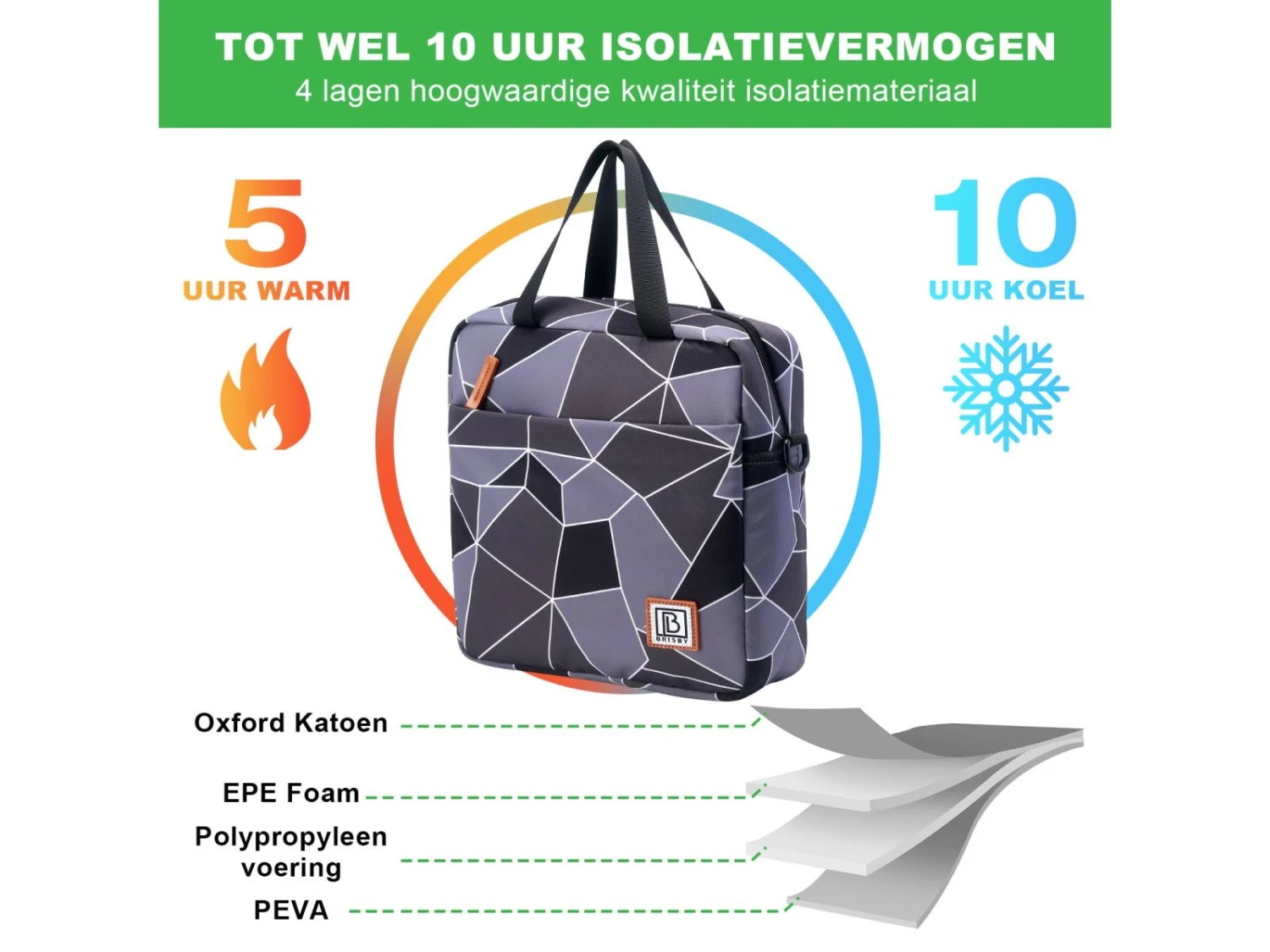 Ben je op zoek naar een topkwaliteit koeltas? Brisby 4 Laags Geïsoleerde Koeltas – Lunchtas 7 liter – Abstract Grijs en Zwart – Lunchtas voor onderweg – Inclusief schouderband – 2 gratis koelelementen van 200 ML.Wil jij je lunchpakket koel bewaren? Dat is mogelijk met deze slimme koeltas van Brisby. De veelzijdige lunchbox is geschikt voor je werk, school, vakantie en vrije tijd, en heeft een totale inhoud van 7 liter. De inhoud blijft tot wel 12 uur koel en vers, en dus hoef je eten en drinken niet in de koelkast te leggen. Bij aankoop ontvang je namelijk twee gratis koelelementen. Bovendien heb je je eten en drinken altijd bij de hand, want er is ook ruimte voor een flinke drinkfles. De alles-in-een tas beschikt tevens over een opbergvak aan de voorzijde voor bijvoorbeeld je sleutel, telefoon en portemonnee. Op die manier heb je alles binnen handbereik. Wat wil je nog meer? Maak een lange wandeling, neem de tas mee op vakantie of gebruik hem iedere dag voor je werk.• Koelen en warm houdenMet de lunchtas is het mogelijk om voedingswaren zowel te koelen als warm te houden. Een uitkomst tijdens ieder seizoen van het jaar.• Comfortabele handvatten en schouderbandJe bent verzekerd van optimaal draagcomfort dankzij de schouderband en de dubbele comfortabele handvatten. Ideaal als je naar je werk loopt of een wandeling maakt in het bos.• Slijtvaste buitenzijdeDe buitenzijde is slijtvast en gemaakt van waterafstotend materiaal met een hoge dichtheid. Wees dus niet bang als je overvallen wordt door een plotselinge regenbui.• Afneembare binnenzijdeDe binnenzijde van de koeltas is eenvoudig afneembaar en op die manier is hij gemakkelijk schoon te houden. Zo kan je de lunchtas gedurende langere tijd gebruiken voor allerlei doeleinden.• Meerdere isolatielagenHet koelvak van de lunchtas beschikt over een dikke laag hoogwaardig PEVA-folie. Zo blijft de inhoud tot wel 12 uur koel. Neem daarom gerust je lunchpakket of vers fruit mee naar je werk, school of tijdens een uitstapje op vakantie.