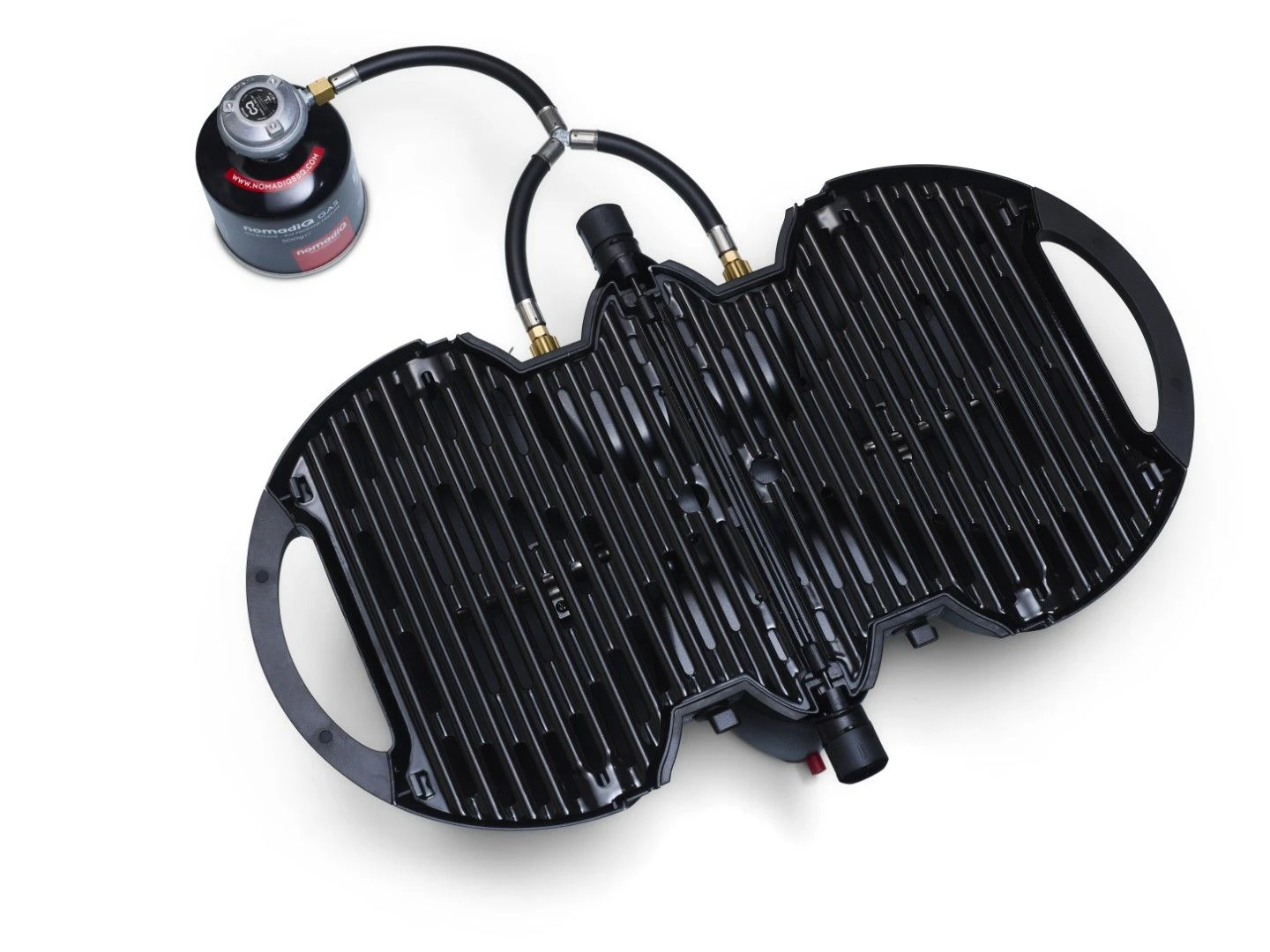 De nomadiQ BBQ kan standaard aangesloten worden op een wegwerpbare gasfles (30 mbar met schroefventiel voor butaan-/ propaangas). Dit zijn veelvoorkomende gasflessen (wegwerpbussen) die bij vrijwel elke bouwmarkt of outdoor winkel verkrijgbaar zijn. Wij bevelen onze eigen 500 gram gasflesjes aan. Gemiddelde griltijd: 2,5 uur. Ook kan de nomadiQ BBQ op een grote gasfles worden aangesloten met onze speciaal ontwikkelde verlengde gasslang.