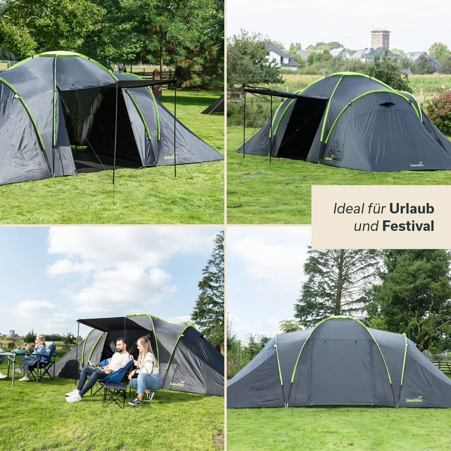 Goed ontworpen familietent met veel functionele extra’s zoals lampophanging, ventilatieopeningen en een ingang die als zonneluifel kan worden gebruikt.