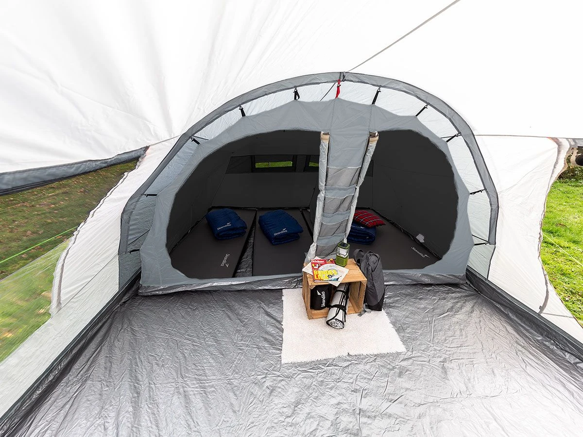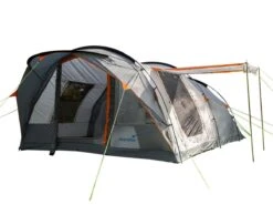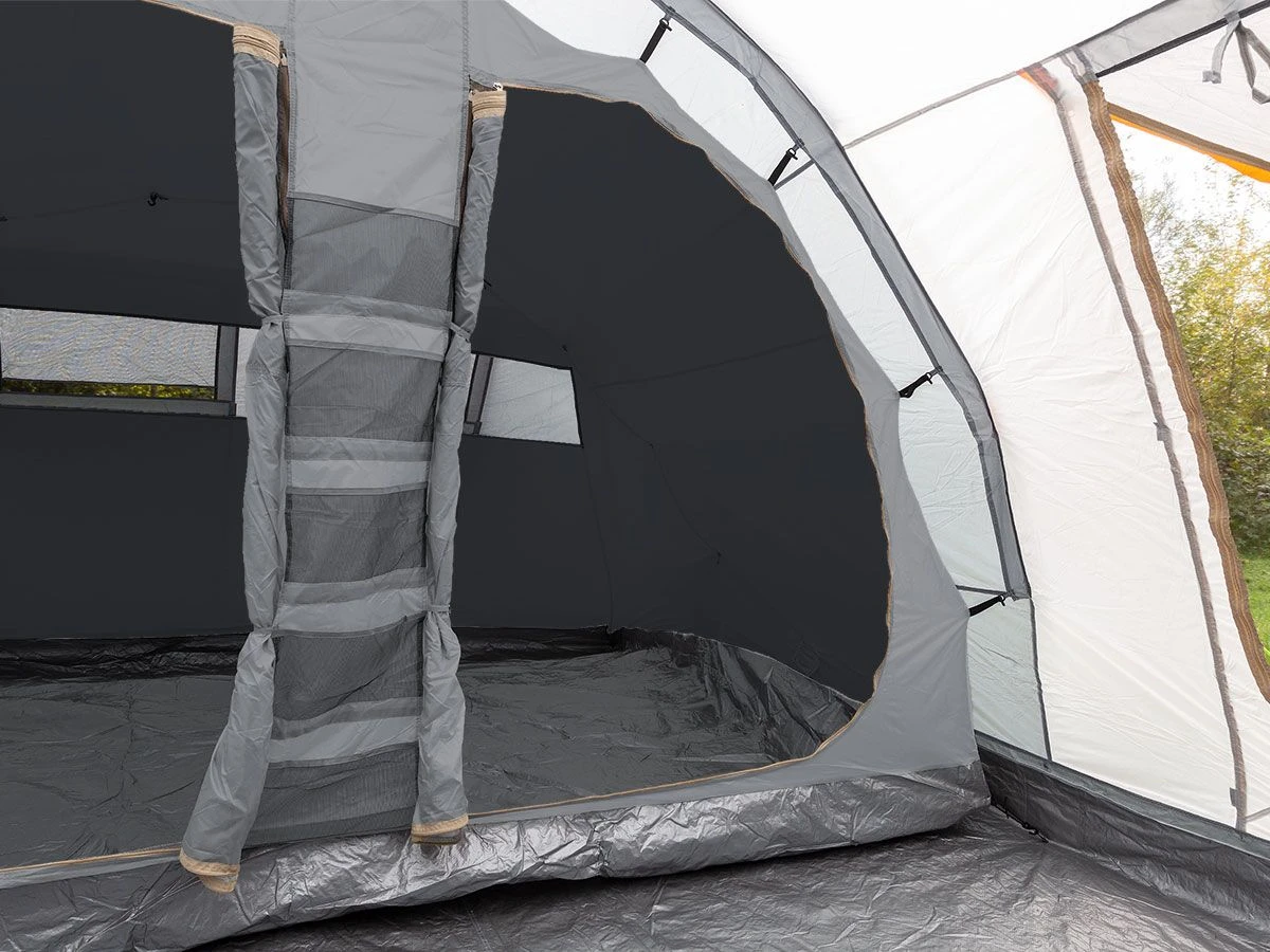 Met twee ruime ingangen met luifels en een groot zijraam, allemaal voorzien van muskietennetten, heeft u een grote hoeveelheid frisse lucht, maar met de nodige bescherming. De voortent is 80 cm lang en beschermt tegen zon of regen. De tweede zij-ingang kan snel worden omgebouwd tot een extra luifel dankzij de twee meegeleverde palen. Het grote woonoppervlak van 200 x 370 cm (2m plafondhoogte) biedt veel ruimte voor extra gasten en een gezellige slaapkamer om te ontspannen op koele avonden. De grote ramen bieden veel natuurlijk licht en zijn allemaal voorzien van een verstelbaar verduisteringssysteem in het interieur. Een groot zijraam bevindt zich direct voor de grote zij-ingang, beide met muskietennetten, waardoor de lucht vrij kan circuleren. De kabeldoorvoer, de opbergvakken en de lantaarnhaak zijn inbegrepen. Aan de achterzijde van de tent bevindt zich een ruime cabine van 215 x 340 cm voor maximaal 5 personen, met een scheidingswand (voor 1 of 2 slaapplaatsen).