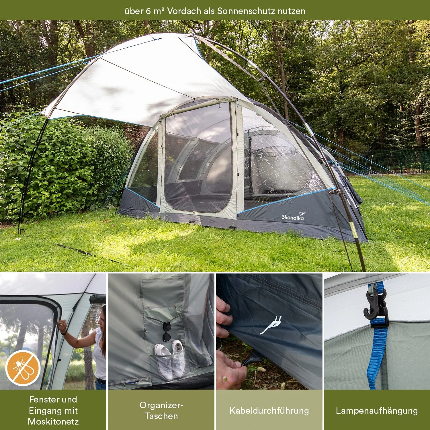 Ruime tent voor 6 personen met veel ruimte binnen en een grote luifel aan de voorkant voor bescherming tegen het weer en schaduw.