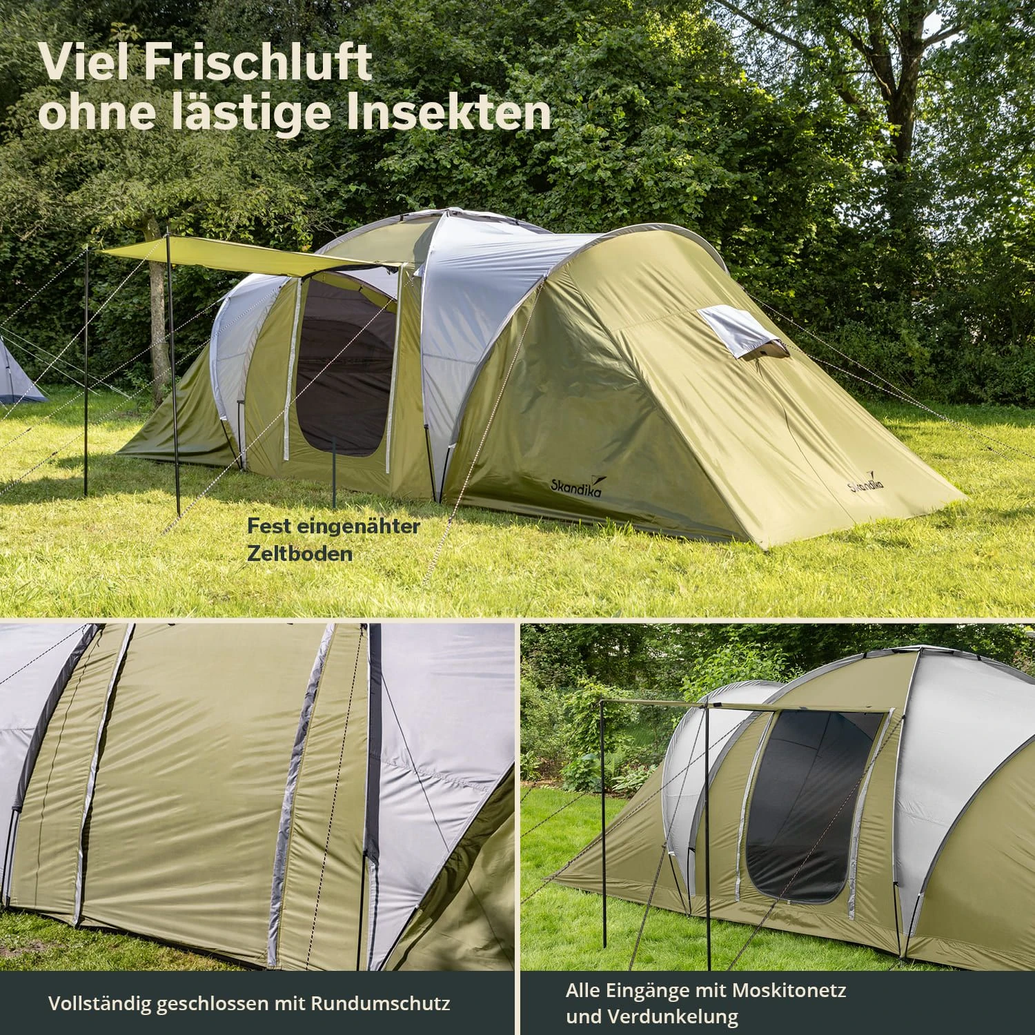 De grote slaapcabines bieden elk voldoende ruimte voor 2 personen en hebben ook muskietengaas bij de ingangen voor bescherming tegen insecten en zijn qua kleur afgestemd op de tent. De binnencabines kunnen naar wens flexibel aan- en losgekoppeld worden, zodat je eenvoudig de grootte van de leefruimte kunt variëren.