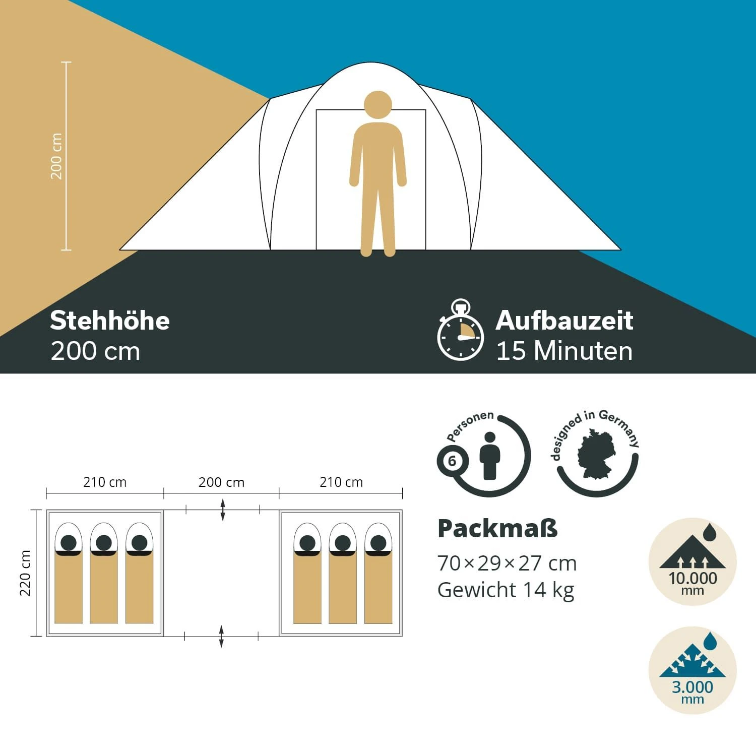 – Buitentent: 100% polyester, PU gecoat, naaddicht