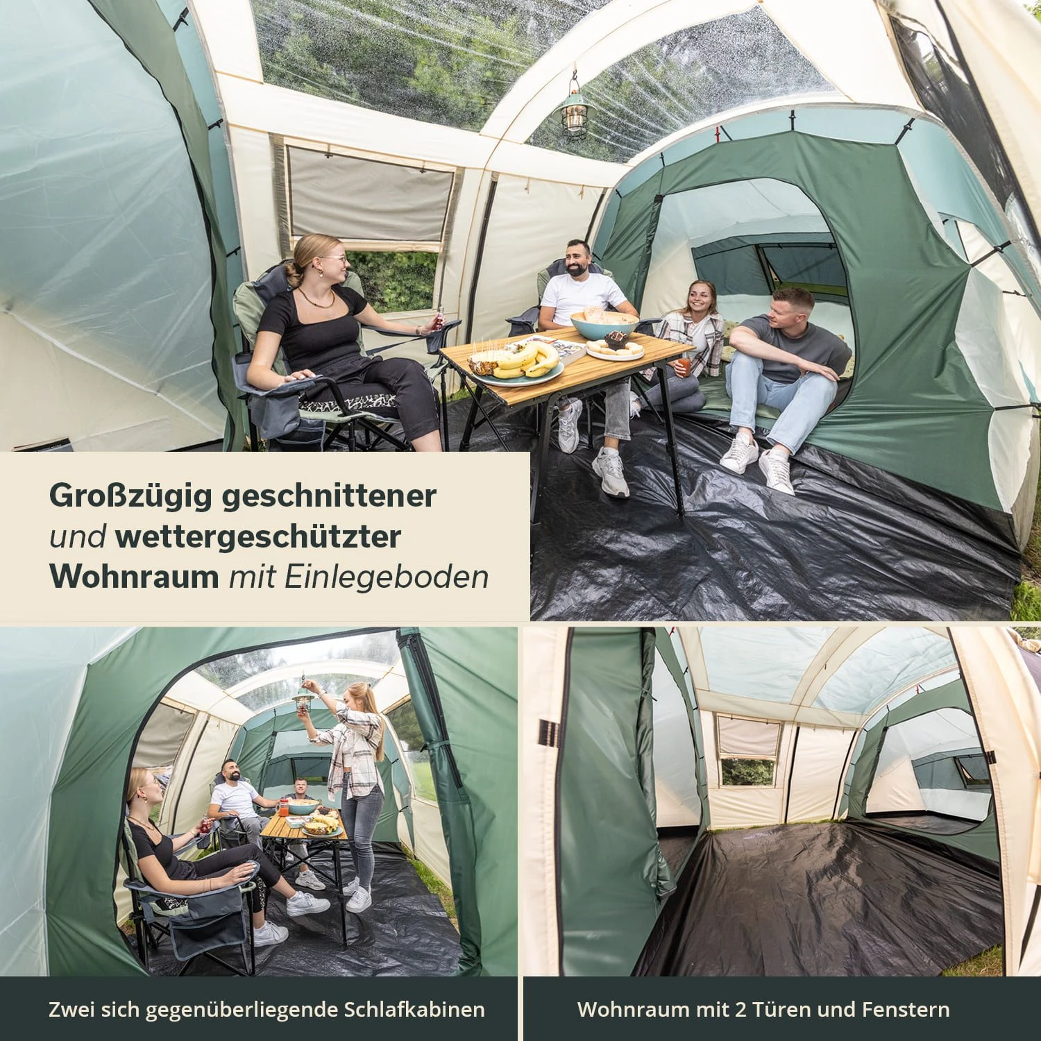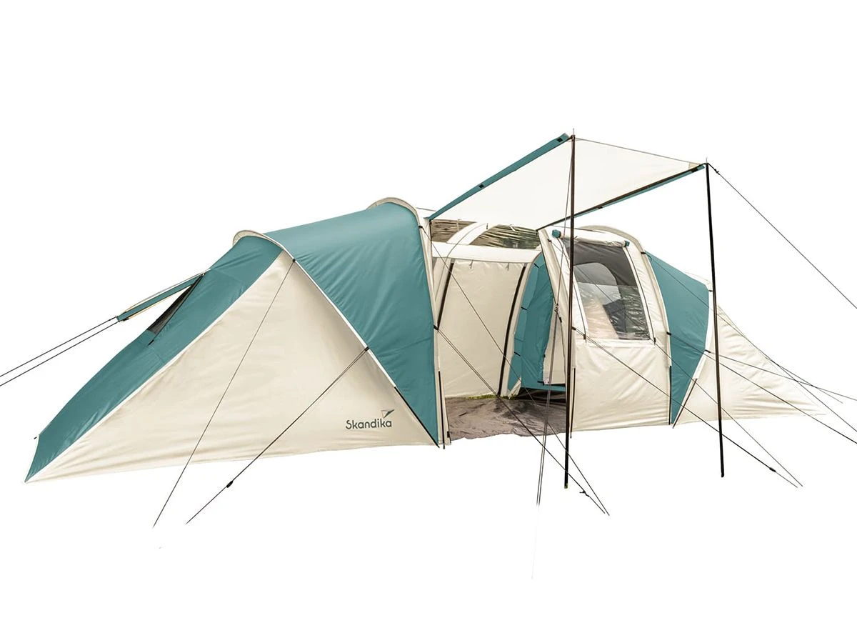 De twee ingangen aan de voor- en achterkant van de tent zijn praktisch en bieden toegang tot het leefgedeelte. Met behulp van de twee meegeleverde stokken kan een van de deuren ook worden gebruikt als schaduwgevende luifel.