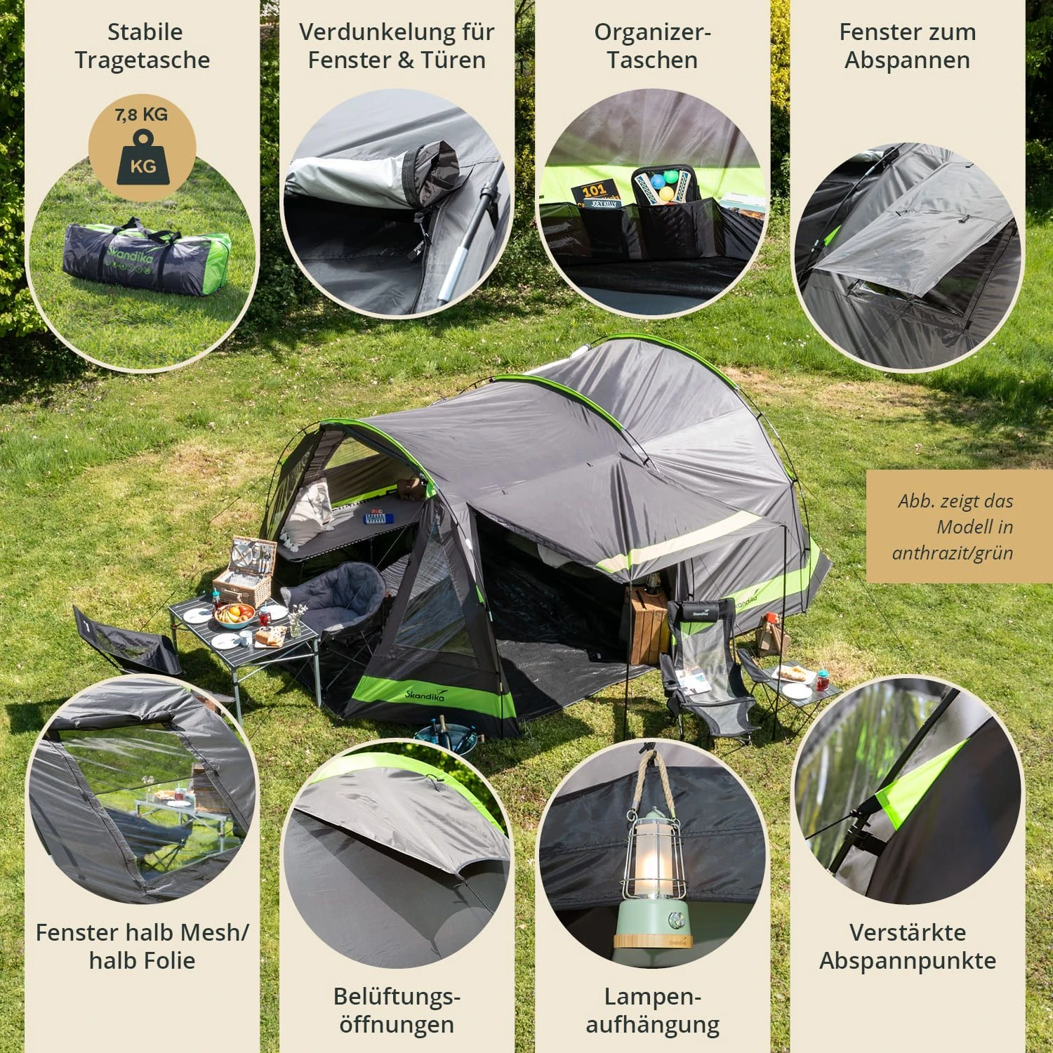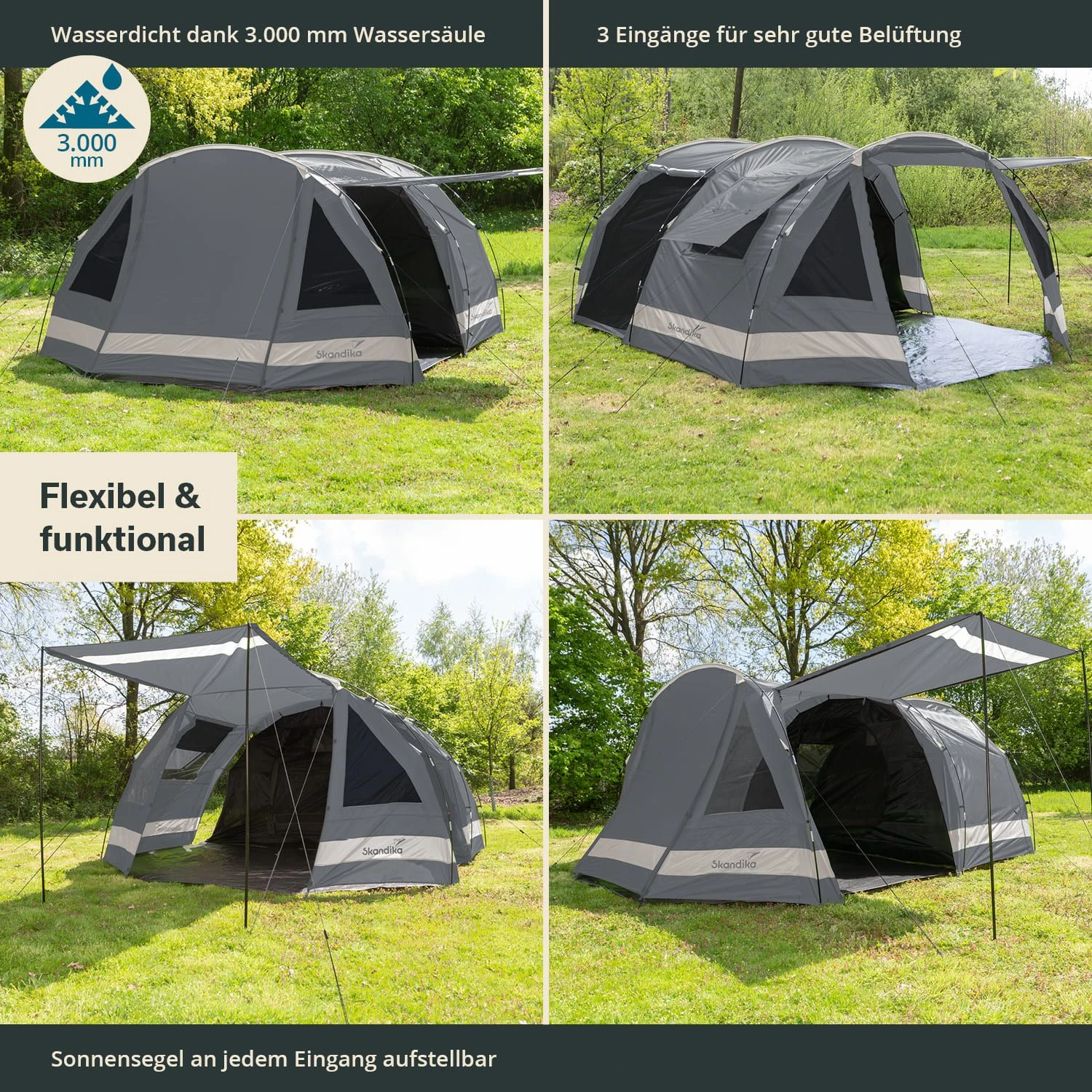 Nieuw is de zilverkleurige coating op de buitentent in de slaapcabine. Hoewel deze coating niet in de buurt komt van het verduisterende effect van de Skandika Sleeper technologie, draagt hij toch bij aan een merkbaar verduisterend effect en zorgt zo voor een rustiger nachtrust. De vestibule is ideaal voor het creëren van een leefruimte met ruimte voor bagage en kampeermeubilair zoals een tafel en stoelen. Dit is een harmonieuze plek om samen te komen voor een maaltijd of om plannen te maken voor de volgende dag. De slaapcabine heeft een eigen vast ingenaaid grondzeil en voor het woongedeelte wordt een apart grondzeil geleverd. Dit creëert ruimte voor een ontwerp op maat.