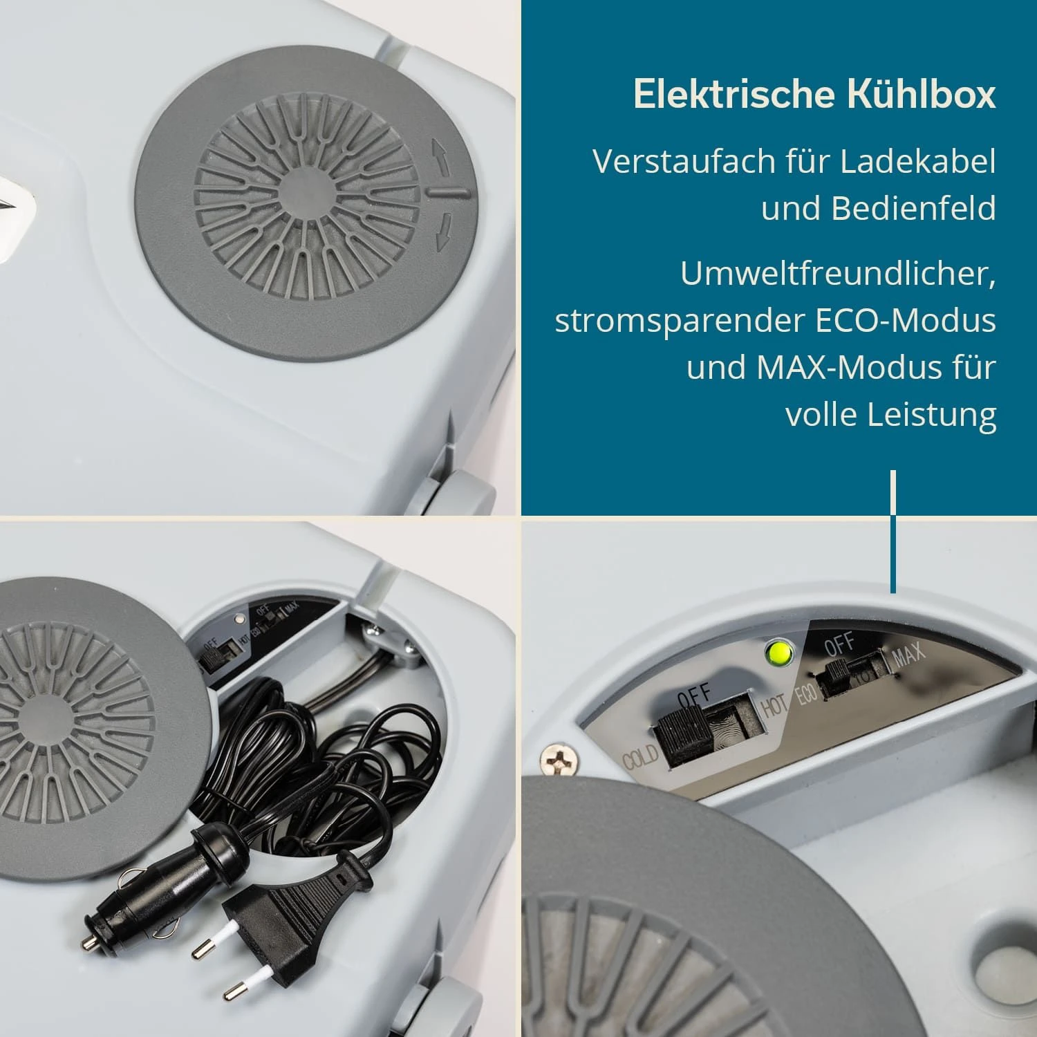 Voor onbeperkte flexibiliteit en mobiliteit heeft de koelbox niet alleen een netaansluiting, maar ook een 12 V sigarettenaanstekerplug voor gebruik in de auto. De koelbox is uitgerust met een totaalontladingsbeveiligingssysteem dat de accu van het voertuig beschermt tegen volledige ontlading. Als de accuspanning te laag wordt, schakelt de koeler automatisch uit en gaat het indicatielampje uit. Om te voorkomen dat kabels in de knoop raken, is er een vak in het deksel ingebouwd voor het opbergen van ongebruikte of noodzakelijke kabels. Er is ook een bedieningspaneel om de koeler aan en uit te zetten en om de bedrijfsmodi in te stellen. Dankzij de ecologische energiebesparingsfunctie is Leira bijzonder energiezuinig, maar werkt toch op volle kracht in de MAX-modus.