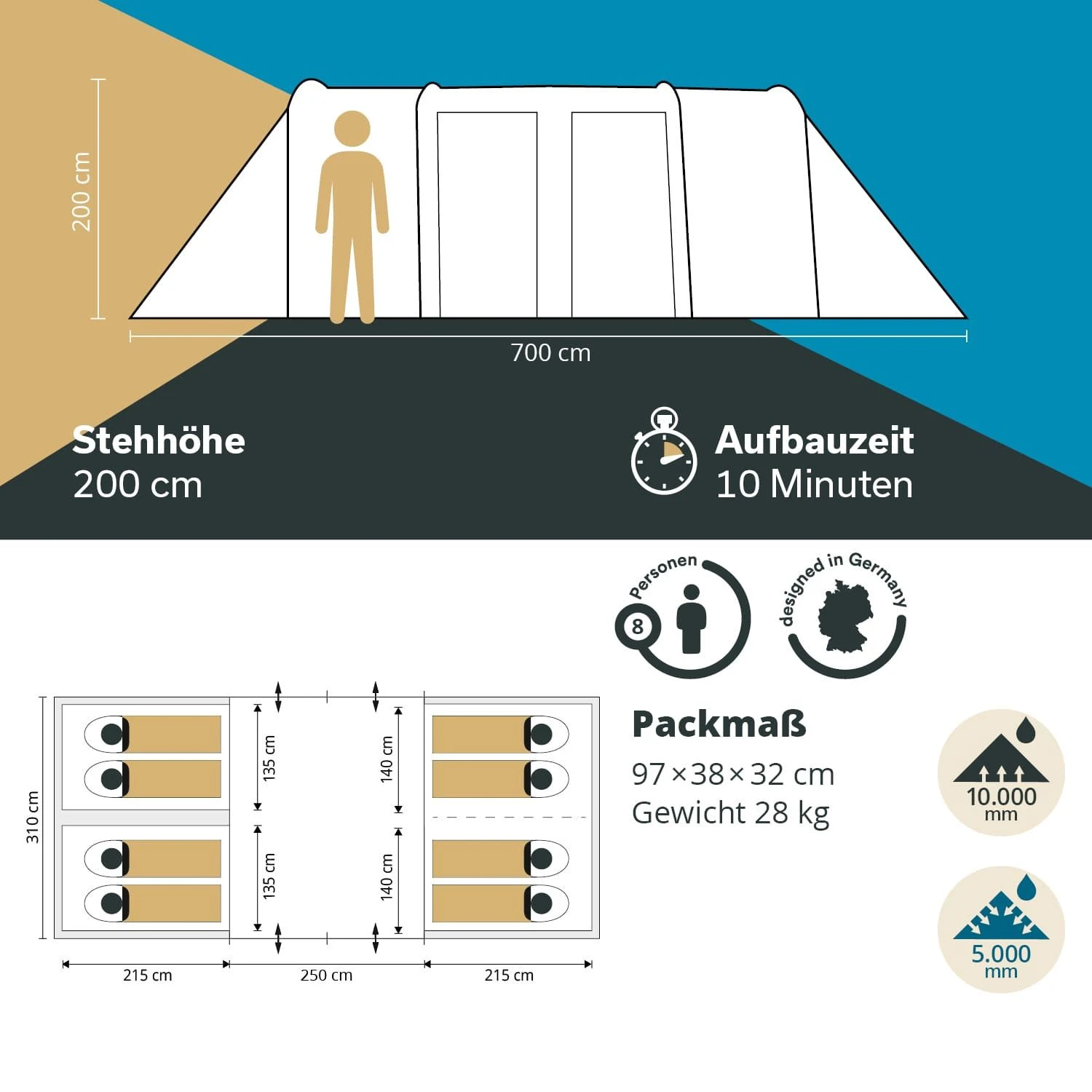 Met een comfortabele stahoogte van 200 cm biedt de grote tent meer dan 21 m² en maakt zo fantastische buitenavonturen mogelijk voor grotere gezinnen en groepen tot 8 personen die niet zonder veel ruimte en bewegingsvrijheid willen.