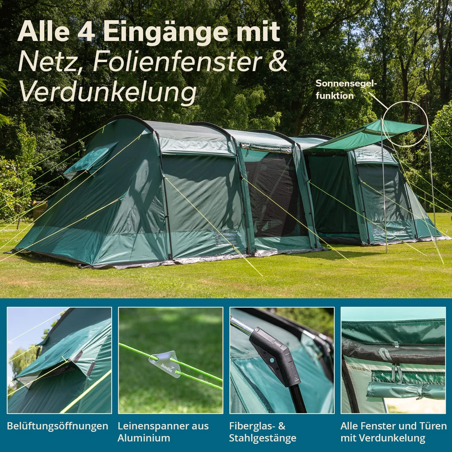 Bij deze versie van de Montana 8 met Skandika Sleeper Technology is er een speciale coating aangebracht op de buitentent in het slaapcabinegebied, die bijna 100% van het zonlicht absorbeert.