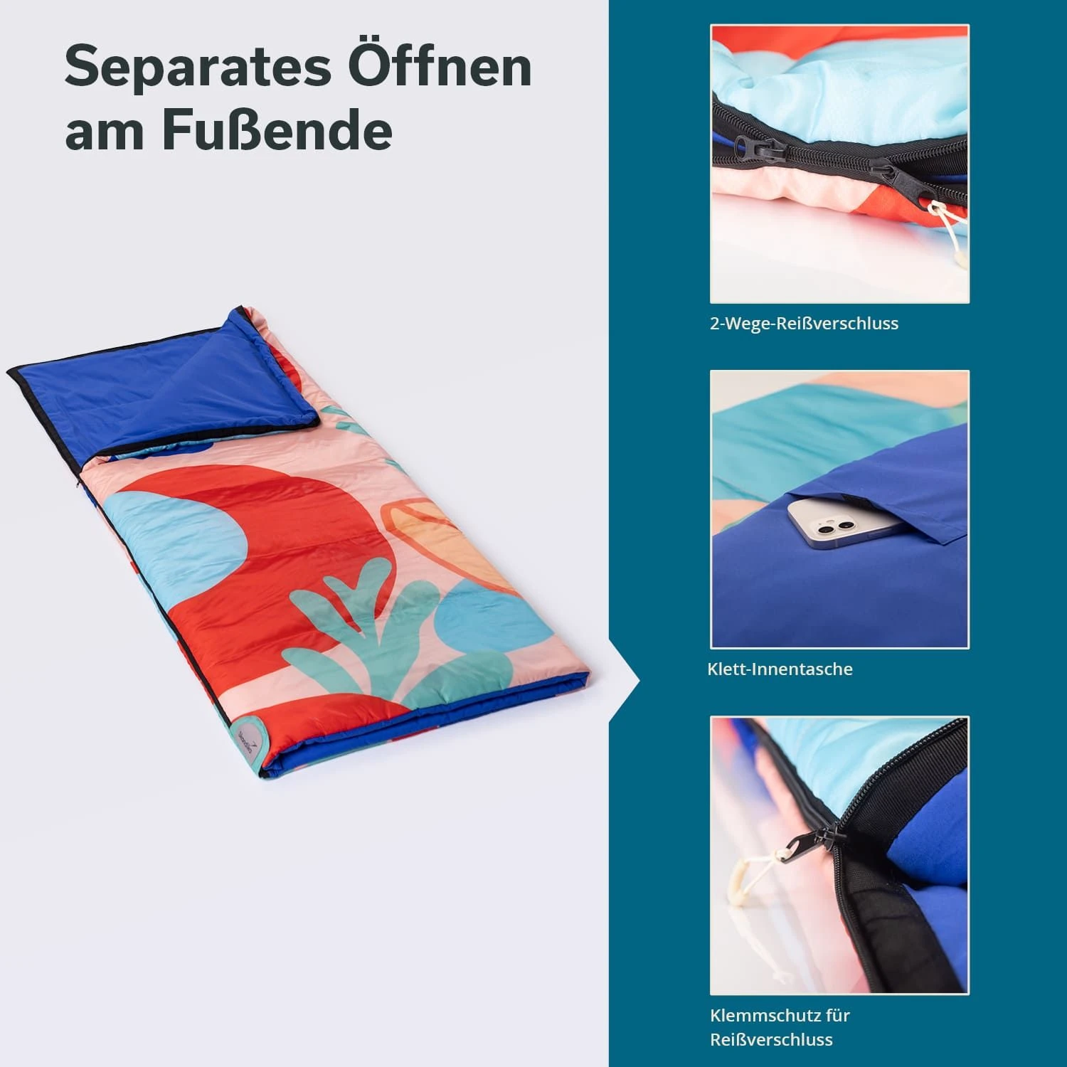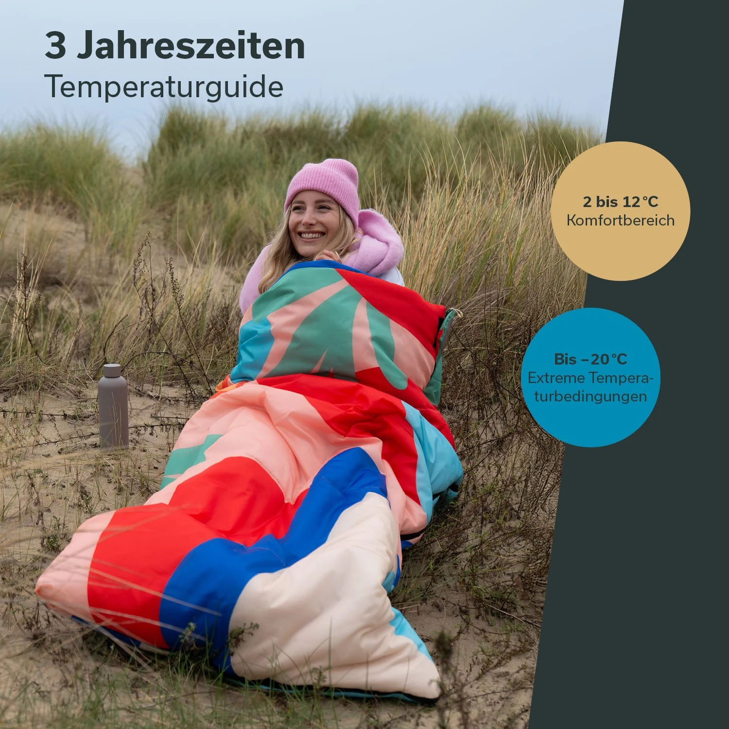 Volledig open verandert Sovros in een praktisch picknickkleed of een knusse throw voor kille avonden – en brengt vrolijkheid in elke omgeving met zijn vrolijke, kleurrijke ontwerpen. Bovendien kunnen twee slaapzakken worden uitgevouwen tot een knus tweepersoonsbed. Je hoeft ze alleen maar uit te spreiden, op elkaar te leggen en dicht te ritsen – en de dubbele slaapzak is klaar! En als je een korte Sovro combineert met een lange Sovro, krijg je zelfs een knusse hoofdsteun.