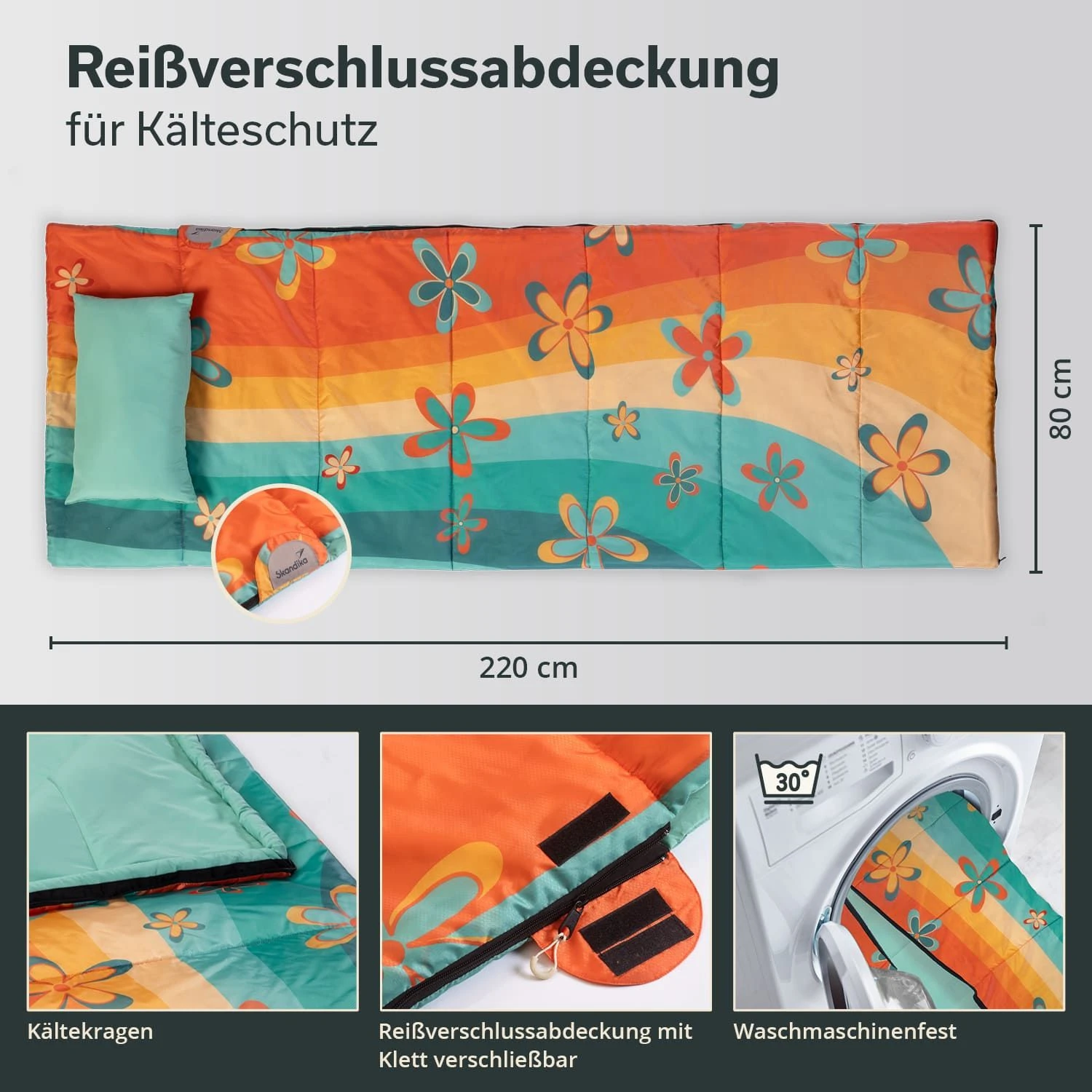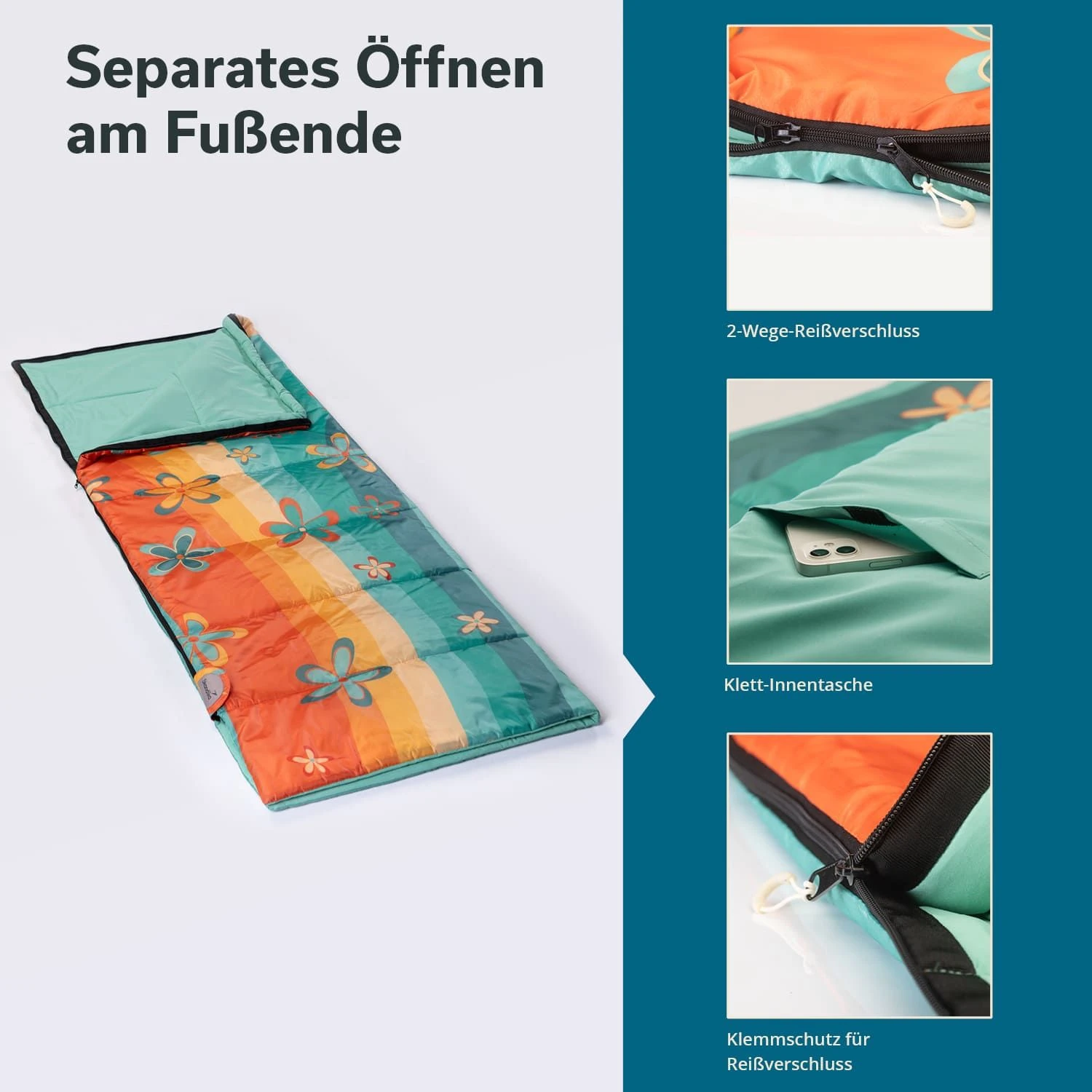 Wanneer de Sovros volledig geopend is, kan hij omgetoverd worden tot een praktisch picknickkleed of een knusse throw voor koele avonden – en de heldere, vrolijke kleuren brengen een goed humeur in elke omgeving. Door ze uit elkaar te ritsen kun je ook twee slaapzakken combineren tot een knus slaapgedeelte voor twee personen. Spreid ze gewoon uit, leg ze op elkaar en rits ze weer aan elkaar – en je dubbele slaapzak is klaar! En als je een korte Sovro combineert met een lange Sovro, creëer je zelfs een zacht kussen voor het hoofd.