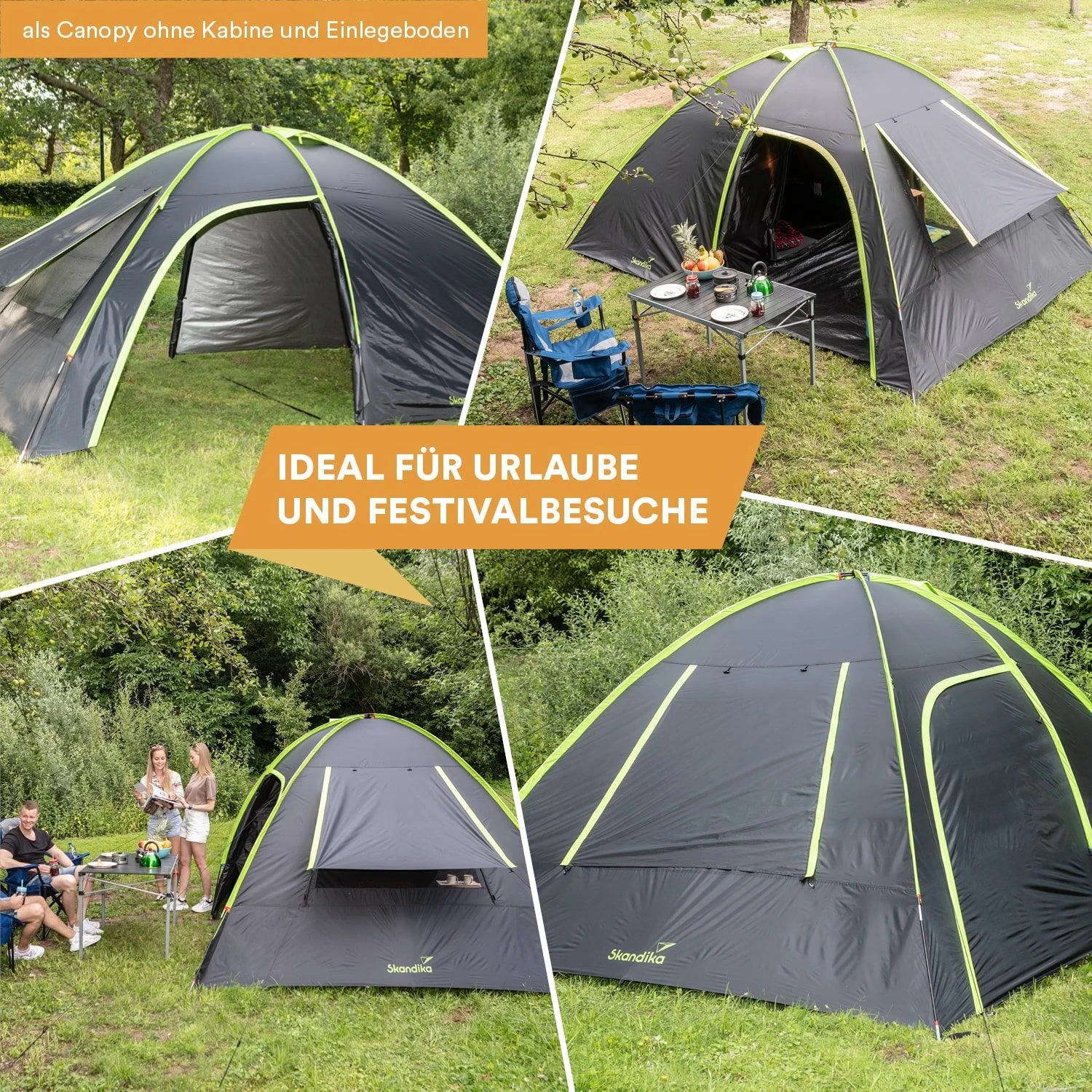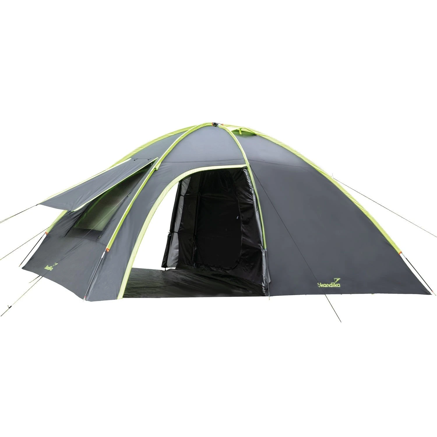 De Skandika Vaasa is een compacte tent voor maximaal 4 personen die snel en gemakkelijk op te zetten is, er slim uitziet in zwart met groene accenten, en perfect is voor vakanties of festivalbezoeken.