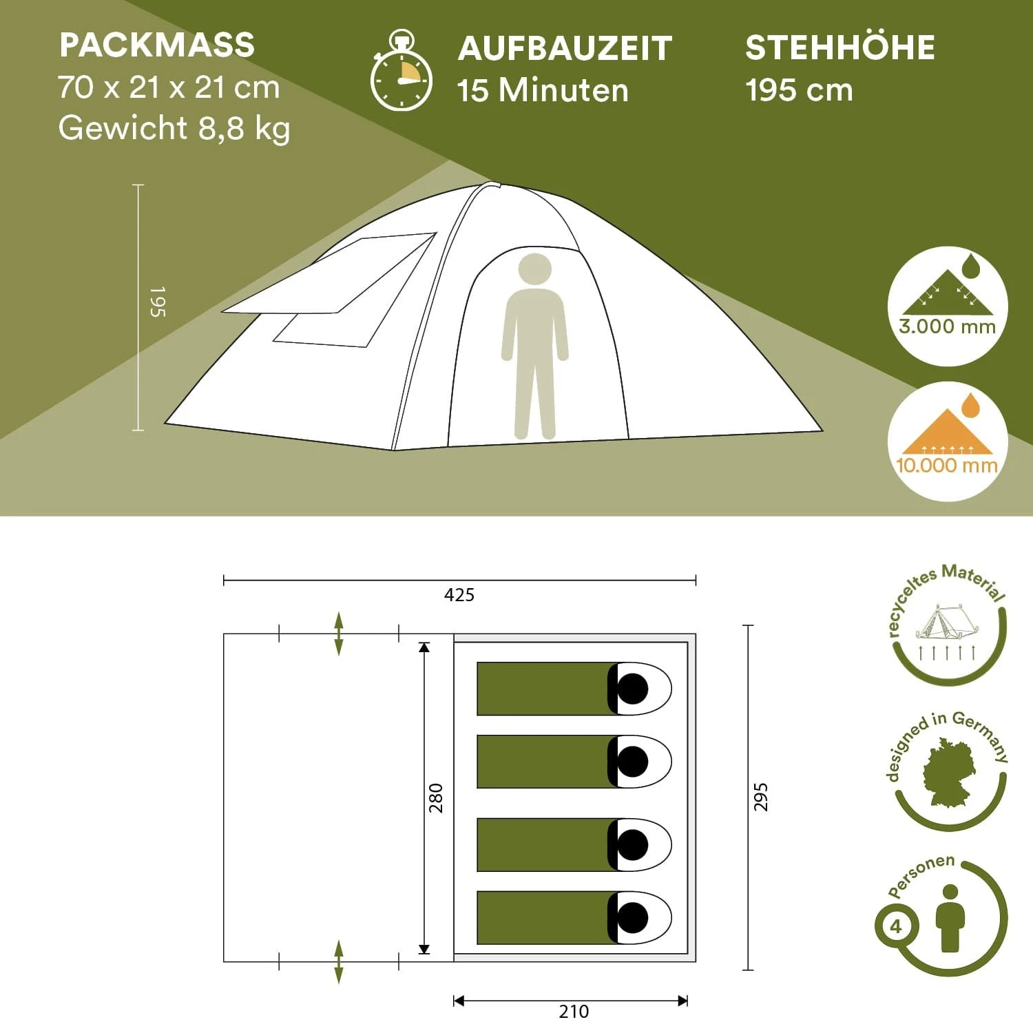 De aantrekkelijke koepeltent heeft een royaal bemeten zwarte slaapcabine voor maximaal 4 personen. De stevig ingenaaide vloer en het muskietennet op de deur zorgen voor bescherming rondom en een aangename nachtrust zonder tocht of vervelende insecten.