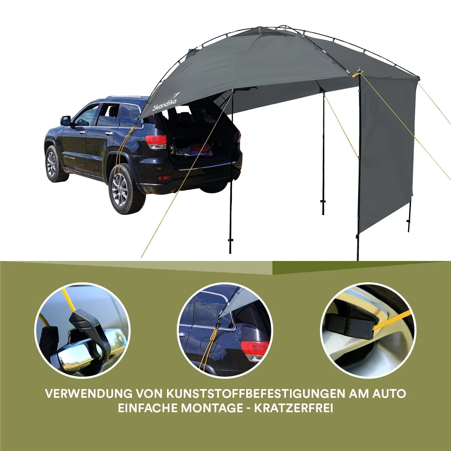 Dankzij de vier meegeleverde opzetstokken kan de zonneluifel op verschillende manieren met of zonder auto worden gebruikt, bijv. vrijstaand als paviljoendak, zijdelings op de grond opgesteld als uitzicht- en windscherm of zelfs gewoon leunend tegen een bouwmuur of een muur. Het aparte windscherm kan naar wens met klittenband aan de luifel worden bevestigd om een extra ondoorzichtig, schaduwrijk oppervlak te creëren.