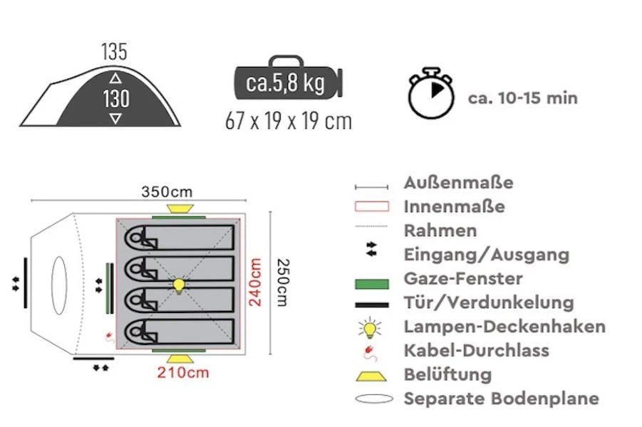 De AKASA is snel en eenvoudig op te zetten en af te breken en is een compacte metgezel, of u nu op een festival staat of op uw volgende kampeervakantie. Door de lage constructie is de tent zeer wind- en stormbestendig. De buitentent met opvallend patroon in reliëf is gemaakt van 100% gerecycleerd polyester, dat werd vervaardigd uit PET-flessen. De vloer is gemaakt van polyethyleenfolie, stevig geïntegreerd in de binnentent, uitneembaar voor de vestibule. In combinatie met het fijne gaasweefsel in de dakbekleding wordt een optimale ventilatie gegarandeerd, met gelijktijdige bescherming tegen vliegende insecten. De PE-folievloer biedt ook een goede bescherming tegen vocht.