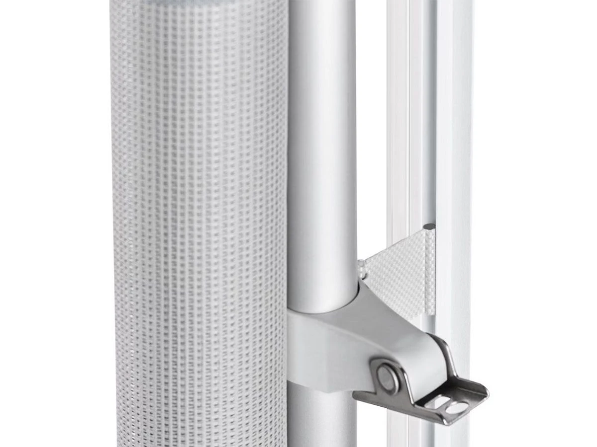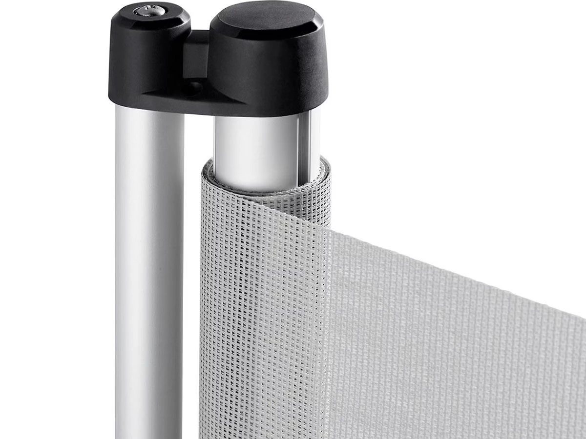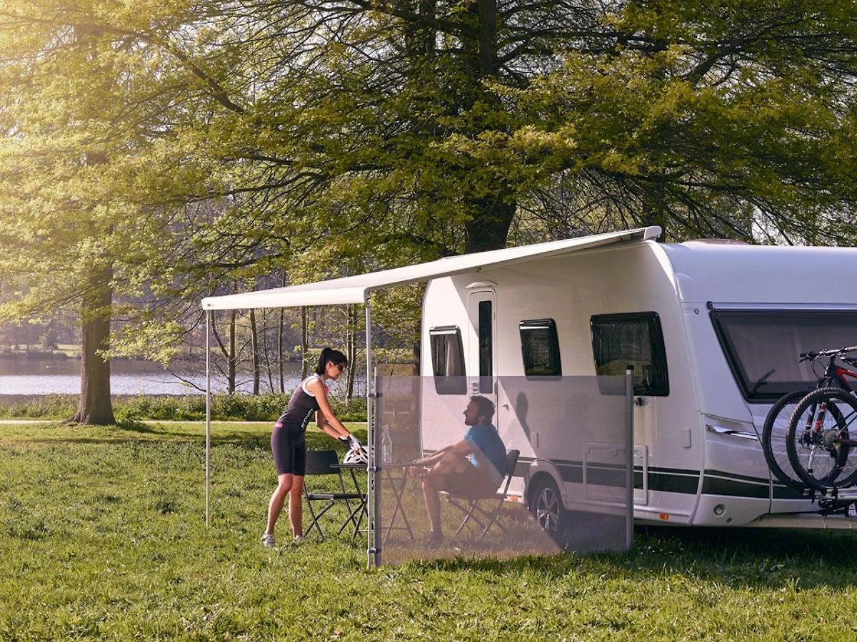 Het Thule Windscreen is een windscherm dat zich automatisch oprolt. Het scherm is te bevestigen aan de wand van de caravan of kampeerauto d.m.v. een vaste houder op de wand of in de caravanrail. Het geheel is zeer eenvoudig te verwijderen. De andere zijde wordt met klittenband aan de staander vast gemaakt.
