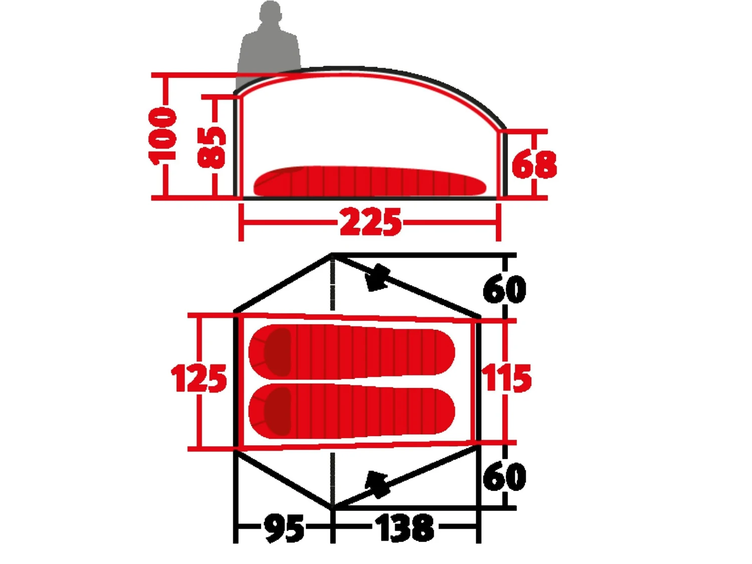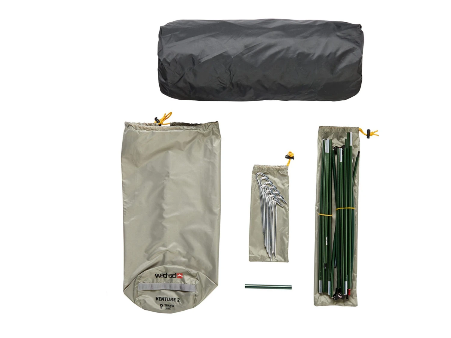 De Venture 2 is een vrijstaande geodetische tent voor twee personen – inclusief twee apsissen. Twee aluminium knopen op de palen zorgen voor een goede windstabiliteit. Eerst wordt de binnentent van de Venture opgezet. De extra boog met stokken vormt de voortent zodra de buitentent eroverheen gespannen is. Voor bescherming tegen licht weer kan de buitentent ook los worden opgezet met behulp van het grondzeil. De binnentent is voorzien van horren in de deuren en aan het voeteneinde en hoofdeinde. Drie extra binnententzakken houden alles netjes en bieden ruimte voor kleine spullen die anders rondslingeren